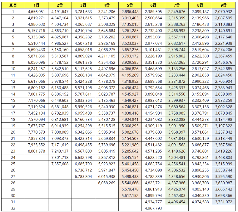 위 표는 기본급만을 반영한 것으로, 실제 급여는 각종 수당이 추가됩니다.